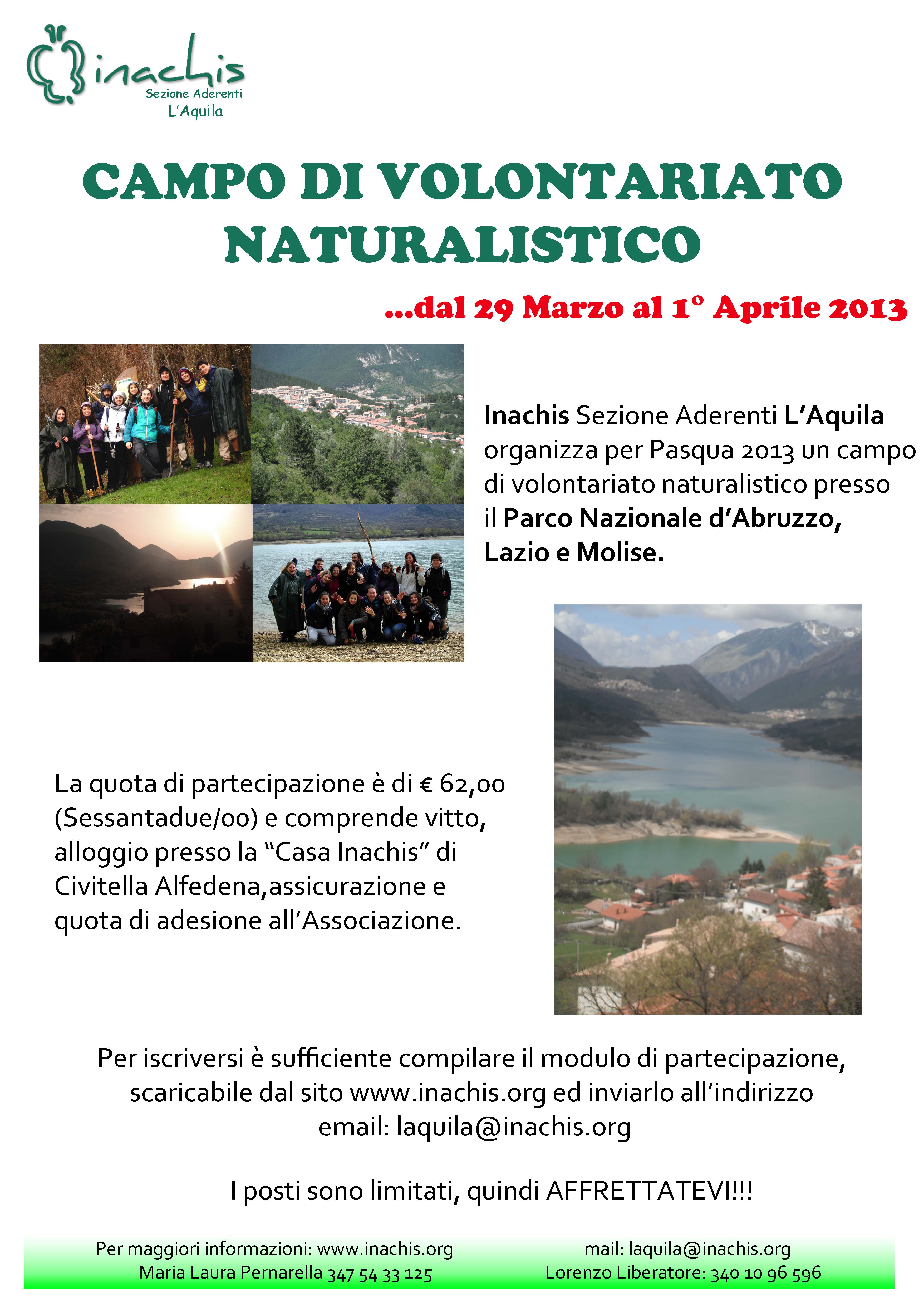 Il campo si svolgerà dal giorno venerdì 29 marzo al giorno lunedì 1° aprile 2013 e verrà utilizzata come sede la “Casa Inachis” di Civitella Alfedena. La quota di partecipazione è di 62.00 euro comprensiva di vitto, alloggio, assicurazione e tessera di adesione all’Associazione Inachis (da pagare con versamento su Postepay).