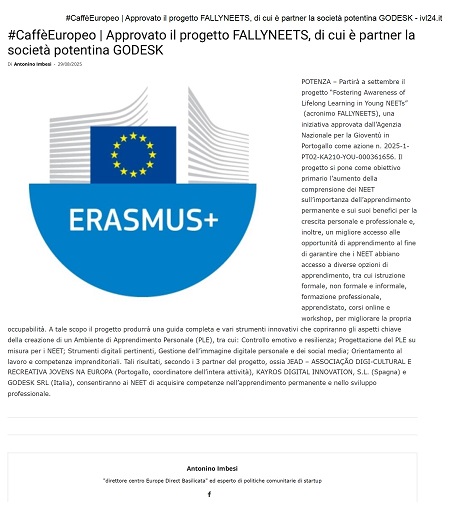 418-Approvato il progetto FALLYNEETS, di cui è partner la società potentina GODESK