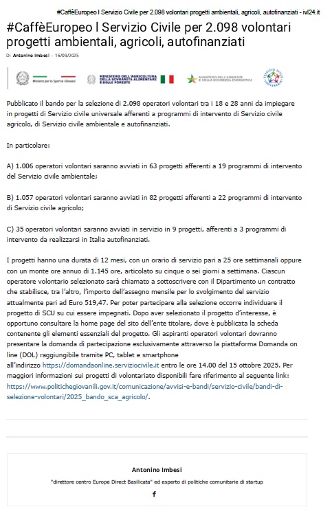 450-Servizio Civile per 2.098 volontari da impiegare in progetti ambientali, agricoli, autofinanziati