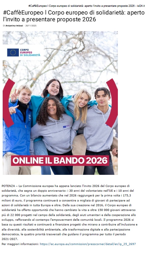 597-Corpo europeo di solidarietà: aperto l’invito a presentare proposte 2026